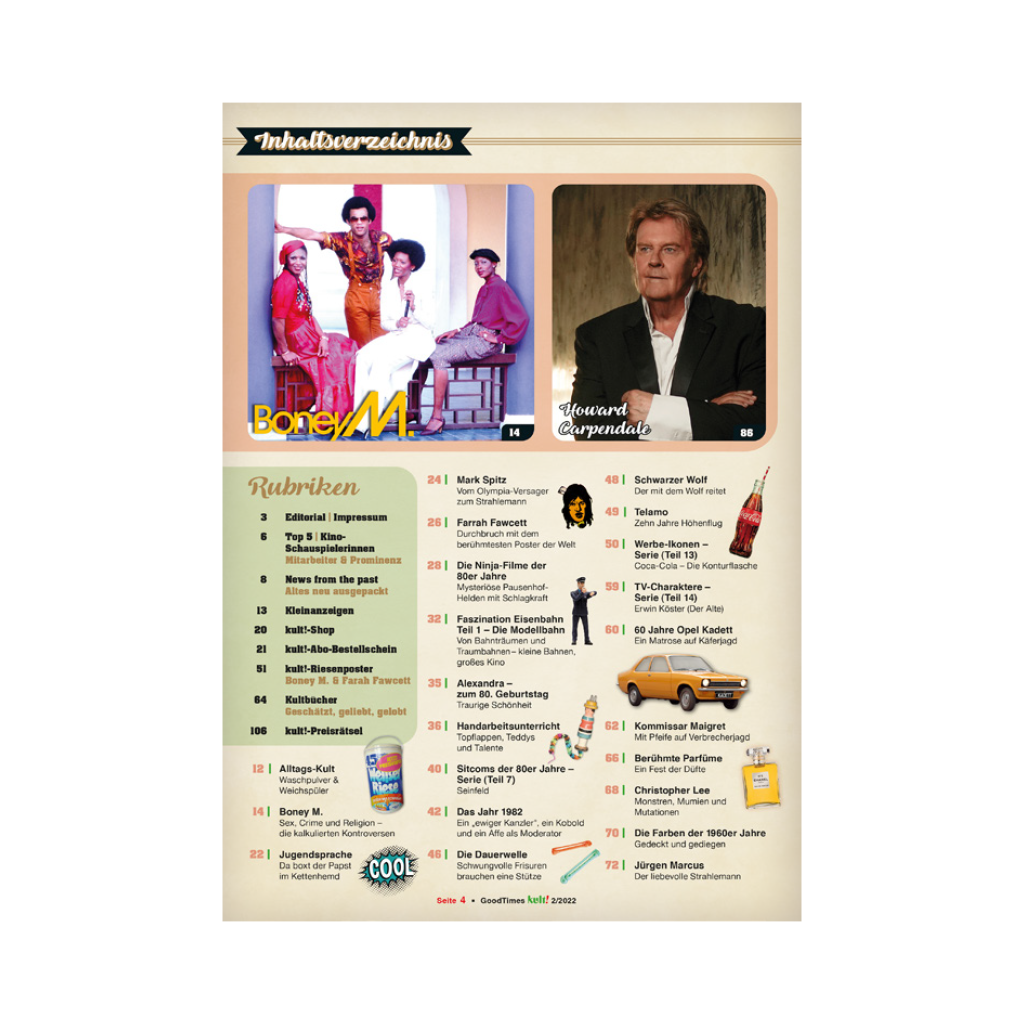 Alltags-Kult - Nicht nur sauber, sondern rein | Boney M. - Die kalkulierten Kontroversen | Telamo - Zehn Jahre Höhenflug | Jugendsprache - Da boxt der Papst im Kettenhemd | Mark Spitz - Vom Olympia-Versager zum Strahlemann | Farrah Fawcett - Durchbruch mit dem berühmtesten Poster der Welt | Die Ninja-Filme der 80er Jahre - Mysteriöse Pausenhof-Helden mit Schlagkraft | Faszination Eisenbahn Teil 1 – Die Modellbahn - Von Bahnträumen und Traumbahnen / Kleine Bahnen, großes Kino | Alexandra – zum 80. Geburtstag - Traurige Schönheit | Handarbeitsunterricht - Topflappen, Teddys und Talente | Sitcoms der 80er Jahre – Serie (Teil 7) - Seinfeld | Das Jahr 1982 - Ein „ewiger Kanzler“, ein Kobold und ein Affe als Moderator | Die Dauerwelle - Schwungvolle Frisuren brauchen eine Stütze | Schwarzer Wolf - Der mit dem Wolf reitet | Werbe-Ikonen – Serie (Teil 13) - Coca-Cola – Die Konturflasche | TV-Charaktere – Serie (Teil 14) - Erwin Köster („Der Alte“) | 60 Jahre Opel Kadett - Ein Matrose auf Käferjagd | Kommissar Maigrete - Mit Pfeife auf Verbrecherjagd | Kultbücher - Geschätzt, geliebt, gelobt | Berühmte Parfümes - Ein Fest der Düfte | Christopher Lee - Monstren, Mumien und Mutationen | Die Farben der 1960er Jahre - Gedeckt und gediegen | Jürgen Marcus - Der liebevolle Strahlemann | Kartonmodellbau - Träume aus Papier | MV 67 Die spannende Abenteuer-Illustrierte - Comics von A wie Asterix bis V wie Voss | Maggi - Die Mutter aller Gewürze | 50 Jahre Zack - Das Zack Universum | Die Comics aus dem Freibeuter Verlag - Horror aus Italien | Astrid Lindgren - Ich will, dass die Leute feiern!“ | Howard Carpendale - „Ich sehe mich als Entertainer, nicht als Schlagersänger!" | Ireen Sheer - Wieder mal spontan sein | Lone Ranger - Hinter dieser Maske steckte ein Held ohne Tadel | Monty Python – Achtung, Witz! | Die Odyssee - Fantastische Irrfahrt | Gojko Mitic - Der "Chefindianer" der ostdeutschen Defa | Musikboxen - Für 20 Pfennig "Born To Be Wild" | Ferienlager DDR - Disziplin & Anarchie | Als Bayern und Gladbach die Bundesliga rockten - Bomber, Kaiser und wilde Fohlen | Kettcar - Die Freiheit auf vier Rädern