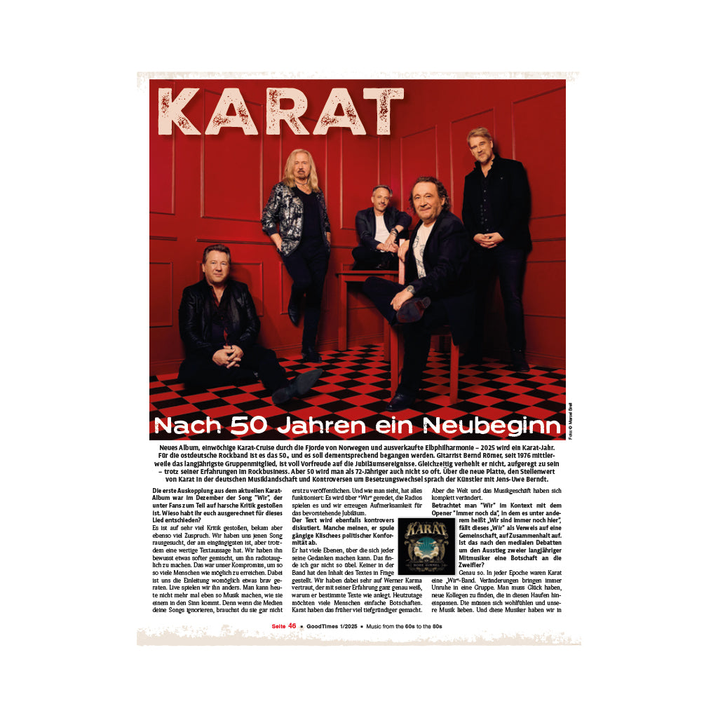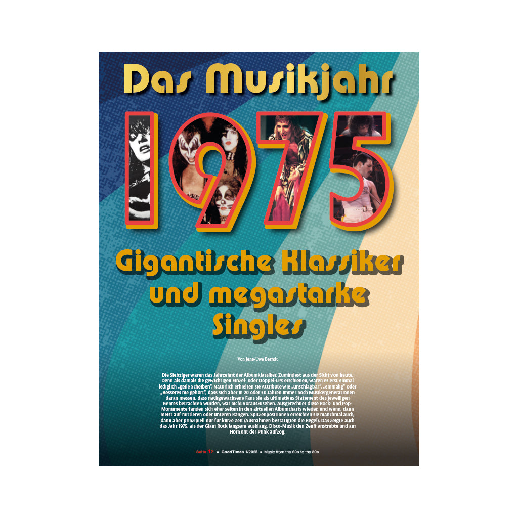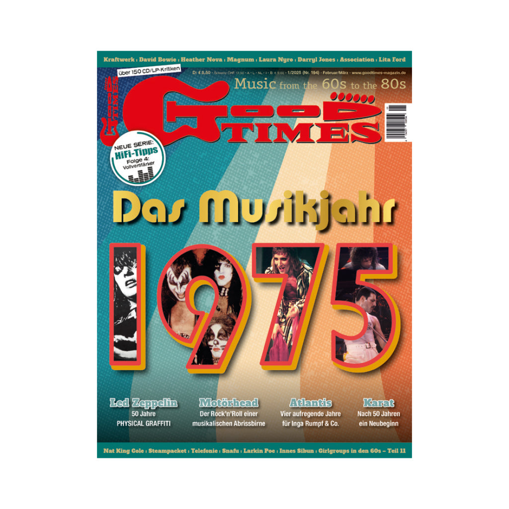 Das Musikjahr 1975 - Gigantische Klassiker und megastarke Singles | Led Zeppelin - Album Cover Art Galerie #53: PHYSICAL GRAFFITI | Kraftwerk - Über 50 Jahre auf der Überholspur | Laura Nyro - Das weibliche Chamäleon | Reinhard Kleist - Underground-Pinselstrich | Magnum - Abschied ist das schärfste Schwert | Motörhead - Der Rock’n’Roll einer musikalischen Abrissbirne | Heather Nova - Die Kostbarkeit eines Augenblicks | Atlantis -Das Personalkarussell drehte sich schnell | Darryl Jones - Stones-Rekordbassist vor Bill Wyman | Thorbjørn Risager & The Black Tornado - Blues aus der Kälte | The Association - Kalifornien war genug | Vanderlinde - Und immer weiter | Lita Ford - Duett mit Glenn Hughes | The Cream Of Clapton Band - Gitarrenunterricht mit Onkel Eric | Karat - Nach 50 Jahren ein Neubeginn | Southern Rock Junkies - Southern-Rock-Testament aus der Oberpfalz | Snafu - Grenzgänger zwischen den Welten | Siggi Schwarz - Tribut für Gary Moore | Nat King Cole - Unvergesslich – Vor 60 Jahren starb einer der erfolgreichsten Sänger der USA | Girlgroups in den 60s – Teil 11 - „We Love The Beatles“ – Girlgroups huldigen den Fab Four | Selling Tickets By The Pound - Alte Konzertkarten sammeln – Ein Marktbericht | Telefonie - Ambitioniertes Konzeptwerk ging in den Wendewirren unter | Songtexte - Falsch verstanden, nicht verstanden | Steampacket - Eine Supergroup ohne Stars | Innes Sibun - Der Gitarre spielende Krankenpfleger | HiFi-Tipps – Folge 4 -Vollverstärker | Albert Böhm - „Musik ist mein Lebenselixier“ | Larkin Poe - Göttliche Teufeleien | Amparo Sanchéz - Und immer wieder verdammter Herzschmerz | … zuguterletzt : - Miller Anderson - Blug, Granfelt & Engelien - Günther Sigl