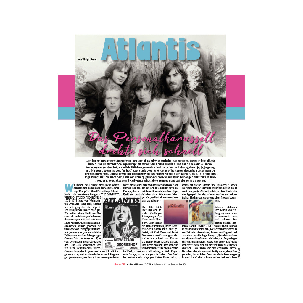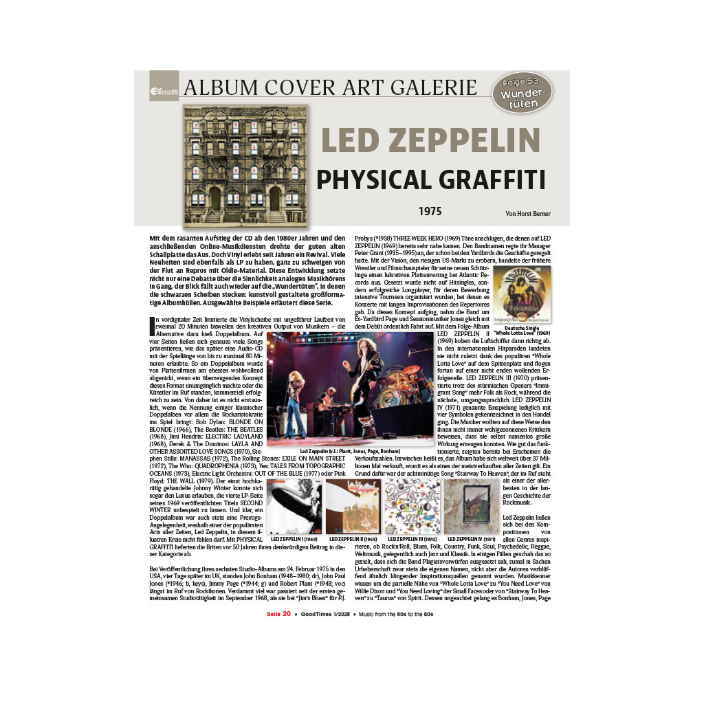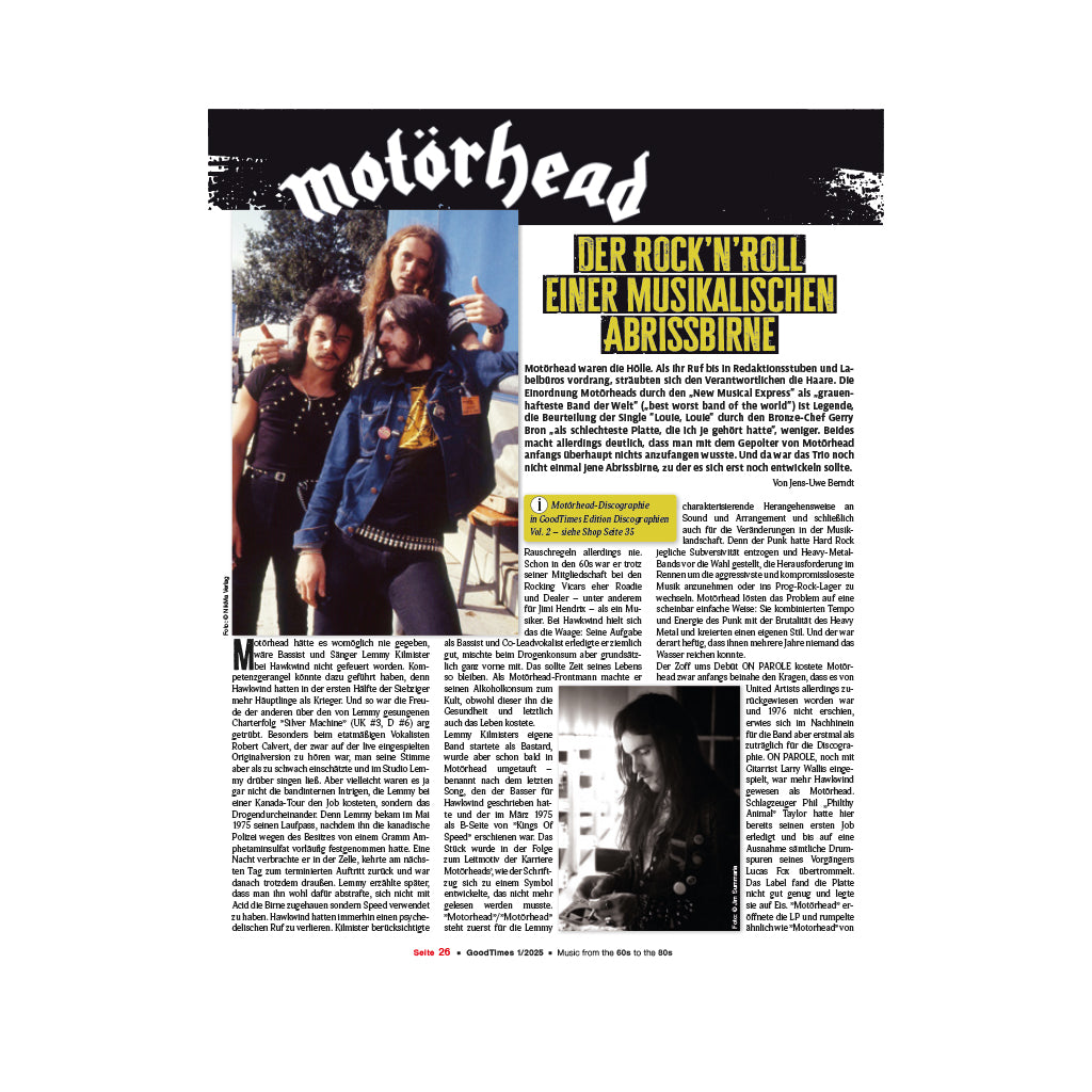 Das Musikjahr 1975 - Gigantische Klassiker und megastarke Singles | Led Zeppelin - Album Cover Art Galerie #53: PHYSICAL GRAFFITI | Kraftwerk - Über 50 Jahre auf der Überholspur | Laura Nyro - Das weibliche Chamäleon | Reinhard Kleist - Underground-Pinselstrich | Magnum - Abschied ist das schärfste Schwert | Motörhead - Der Rock’n’Roll einer musikalischen Abrissbirne | Heather Nova - Die Kostbarkeit eines Augenblicks | Atlantis -Das Personalkarussell drehte sich schnell | Darryl Jones - Stones-Rekordbassist vor Bill Wyman | Thorbjørn Risager & The Black Tornado - Blues aus der Kälte | The Association - Kalifornien war genug | Vanderlinde - Und immer weiter | Lita Ford - Duett mit Glenn Hughes | The Cream Of Clapton Band - Gitarrenunterricht mit Onkel Eric | Karat - Nach 50 Jahren ein Neubeginn | Southern Rock Junkies - Southern-Rock-Testament aus der Oberpfalz | Snafu - Grenzgänger zwischen den Welten | Siggi Schwarz - Tribut für Gary Moore | Nat King Cole - Unvergesslich – Vor 60 Jahren starb einer der erfolgreichsten Sänger der USA | Girlgroups in den 60s – Teil 11 - „We Love The Beatles“ – Girlgroups huldigen den Fab Four | Selling Tickets By The Pound - Alte Konzertkarten sammeln – Ein Marktbericht | Telefonie - Ambitioniertes Konzeptwerk ging in den Wendewirren unter | Songtexte - Falsch verstanden, nicht verstanden | Steampacket - Eine Supergroup ohne Stars | Innes Sibun - Der Gitarre spielende Krankenpfleger | HiFi-Tipps – Folge 4 -Vollverstärker | Albert Böhm - „Musik ist mein Lebenselixier“ | Larkin Poe - Göttliche Teufeleien | Amparo Sanchéz - Und immer wieder verdammter Herzschmerz | … zuguterletzt : - Miller Anderson - Blug, Granfelt & Engelien - Günther Sigl
