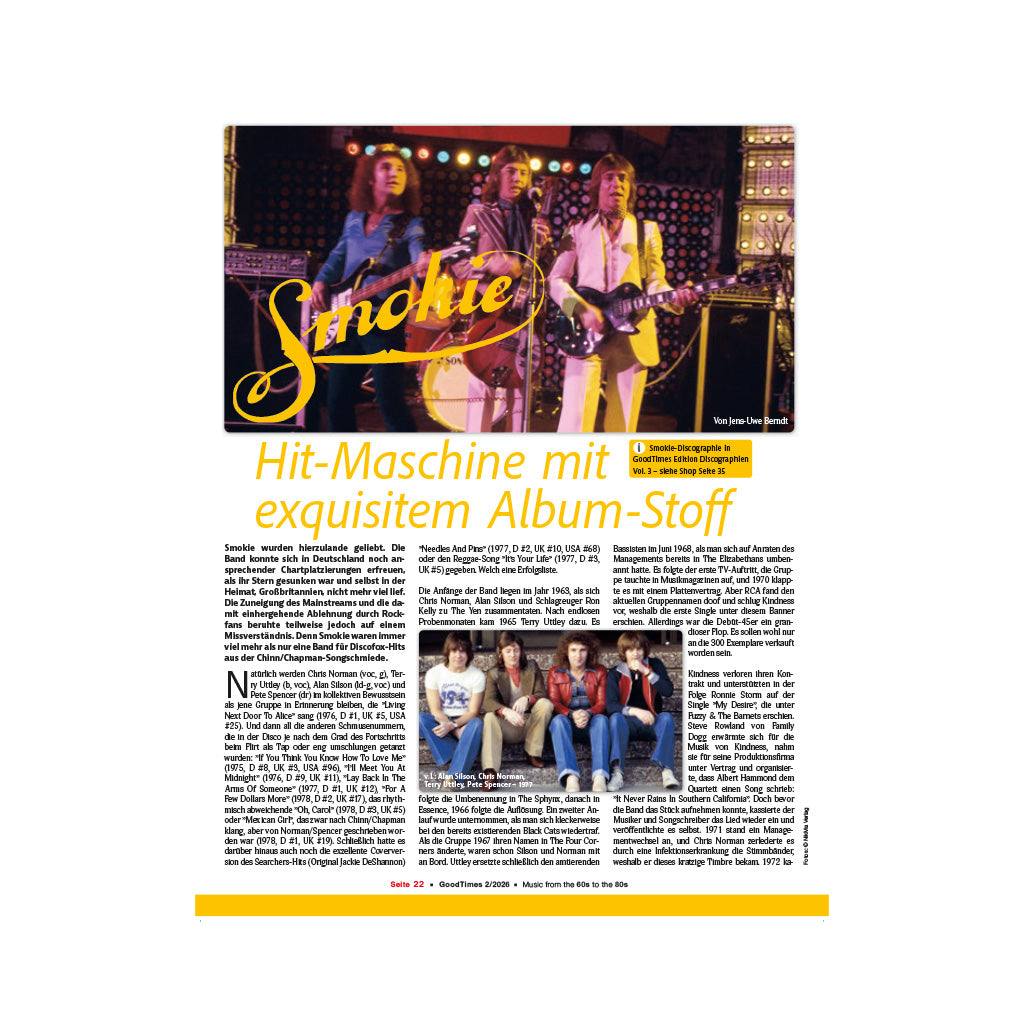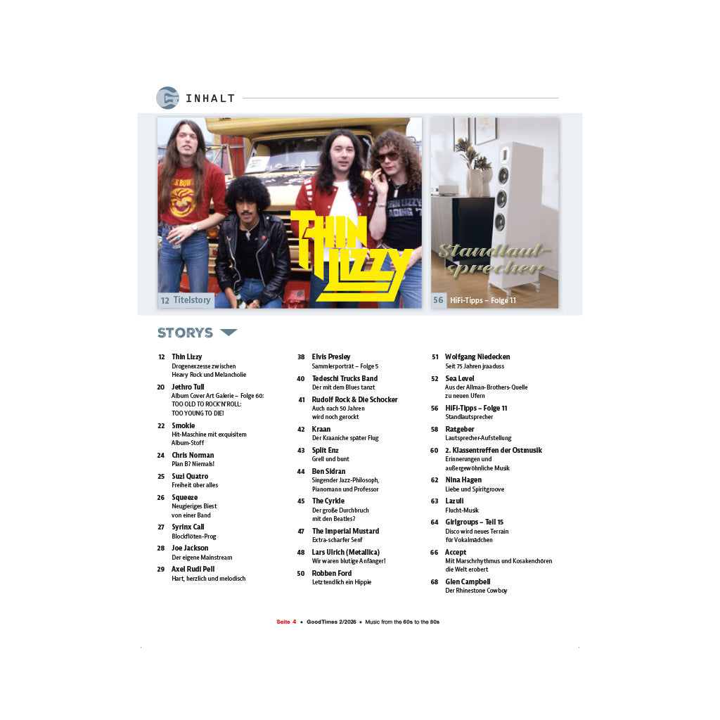 Thin Lizzy - Drogenexzesse zwischen Heavy Rock und Melancholie | Jethro Tull - Album Cover Art Galerie – Folge 60: TOO OLD TO ROCK’N’ROLL: TOO YOUNG TO DIE! | Smokie - Hit-Maschine mit exquisitem Album-Stoff | Chris Norman - Plan B? Niemals! | Suzi Quatro - Freiheit über alles | Squeeze - Neugieriges Biest von einer Band | Syrinx Call - Blockflöten-Prog | Joe Jackson - Der eigene Mainstream | Axel Rudi Pell - Hart, herzlich und melodisch | Elvis Presley - Sammlerporträt – Folge 5 | Tedeschi Trucks Band - Der mit dem Blues tanzt | Rudolf Rock & Die Schocker - Auch nach 50 Jahren wird noch gerockt | Kraan - Der Kraaniche später Flug | Split Enz - Grell und bunt | Ben Sidran - Singender Jazz-Philosoph, Pianomann und Professor | The Cyrkle - Der große Durchbruch mit den Beatles? | The Imperial Mustard - Extra-scharfer Senf | Lars Ulrich (Metallica) - Wir waren blutige Anfänger! | Robben Ford - Letztendlich ein Hippie | Wolfgang Niedecken - Seit 75 Jahren jraaduss | Sea Level - Aus der Allman-Brothers-Quelle zu neuen Ufern | HiFi-Tipps – Folge 11 - Standlautsprecher | Ratgeber - Lautsprecher-Aufstellung | 2. Klassentreffen der Ostmusik - Erinnerungen und außergewöhnliche Musik | Nina Hagen - Liebe und Spiritgroove | Lazuli - Flucht-Musik | Girlgroups – Teil 15 - Disco wird neues Terrain für Vokalmädchen | Accept - Mit Marschrhythmus und Kosakenchören die Welt erobert | Glen Campbell – Der Rhinestone Cowboy